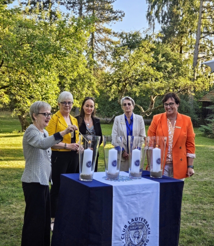Feierliche Kerzenzeremonie mit (v.r.n.l.) Präsidentin SI Lauterbach-Vogelsberg Imke Grünewald, SI Club Metz Past Präsidentin Chantal Ladenburger, SI Deutschland Präsidentin Manuela Nitsche, SI Europa Präsidentin Hafdís Karlsdóttir und Second Director SI World Barbara Kohl. Jede Kerze repräsentiert einen SI-Wirkungskreis: für den SI Club vor Ort, für SI Deutschland, SI Europa und SI World.