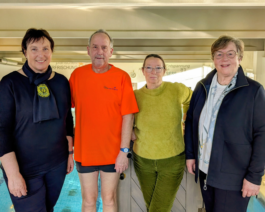 BU: (v.r.n.l.) Dr. Dorle Grünewald-Funk (Präsidentin SI Lauterbach-Vogelsberg), Andrea Hornisch (Caritas), Schwimmlehrer Dieter Weber und Past-Präsidentin Imke Grünewald (SI Lauterbach-Vogelsberg)